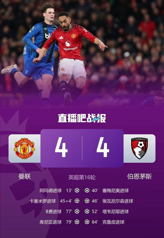 直播吧12月16日讯 英超第16轮,曼联坐镇主场老特拉福德球场迎战伯恩茅斯。上半场,泰勒·亚当斯开场伤退,阿玛德破门,塞梅尼奥扳平,卡塞米罗建功。易边再战,埃瓦尼尔森、塔韦尼耶连入两球,B费任意球直接破门,库尼亚进球,克鲁皮再扳平。最终曼联4-4伯恩茅斯。积分榜方面,曼联26分第六,伯恩茅斯21分第13。